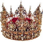 украшенная драгоценными камнями и жемчугом. Ее вес составлял 3 кг. Корону украсили аллегорические фигуры, символизирующие силу и другие достоинства монарха.